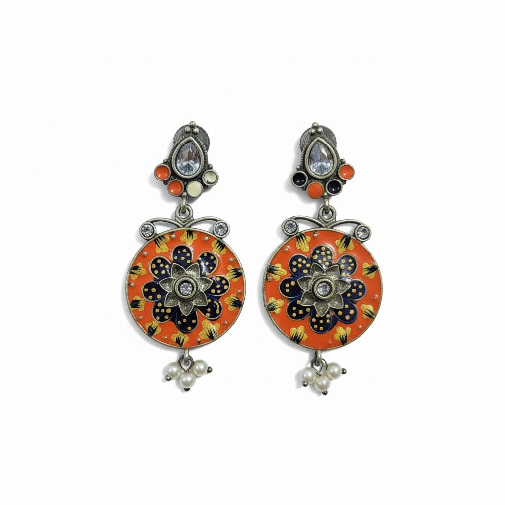 Brighten any celebration with these traditional, hand-painted Meenakari earrings in festive saffron and black.