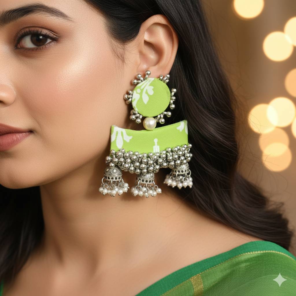 Vibrant lime-green fabric earrings adorned with pearls, silver beads, and three dainty jhumkis for a bold yet graceful festive look.