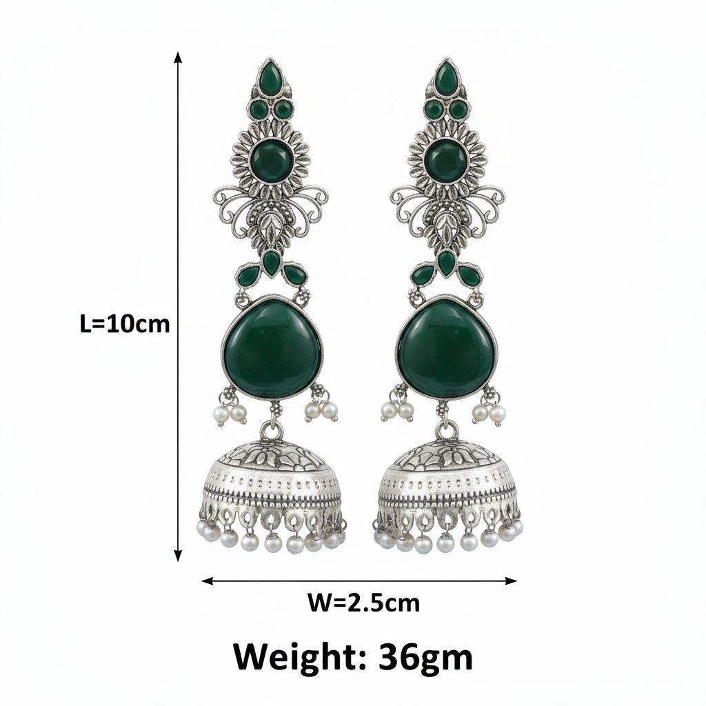 Intricately layered oxidized silver jhumkas that dangle gracefully, reflecting timeless traditional elegance and charm.